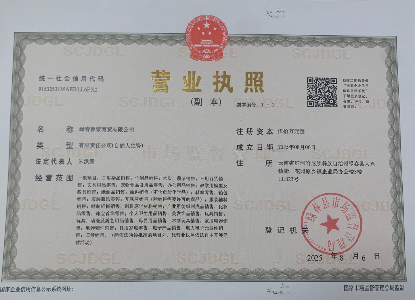 Adresse: LL823, 3. Stock, ehemaliges Bürogebäude des Township Enterprise Bureau, Jiexin Garden, Stadt Daxing, Kreis Lvchun, Autonome Präfektur Honghe der Hani und Yi, Provinz Yunnan